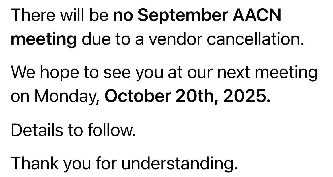 Download Meeting Minutes Monday, September 15, 2025 AACN Agenda - Sept 2025 - cancelled meeting Download File Name Unknown-1.jpeg File Size 58 KB